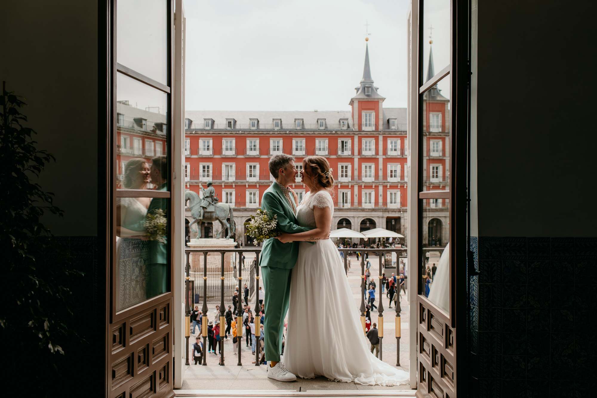Pero lo más especial nos esperaba en la Plaza Mayor, donde la ceremonia civil tuvo lugar en la Casa de la Panadería, uno de los espacios más emblemáticos para casarse en Madrid. Allí, rodeados de familiares y amigos, la emoción llenó cada instante: abrazos que ponían la piel de gallina, sonrisas que lo decían todo y miradas capaces de transmitir más que cualquier palabra.