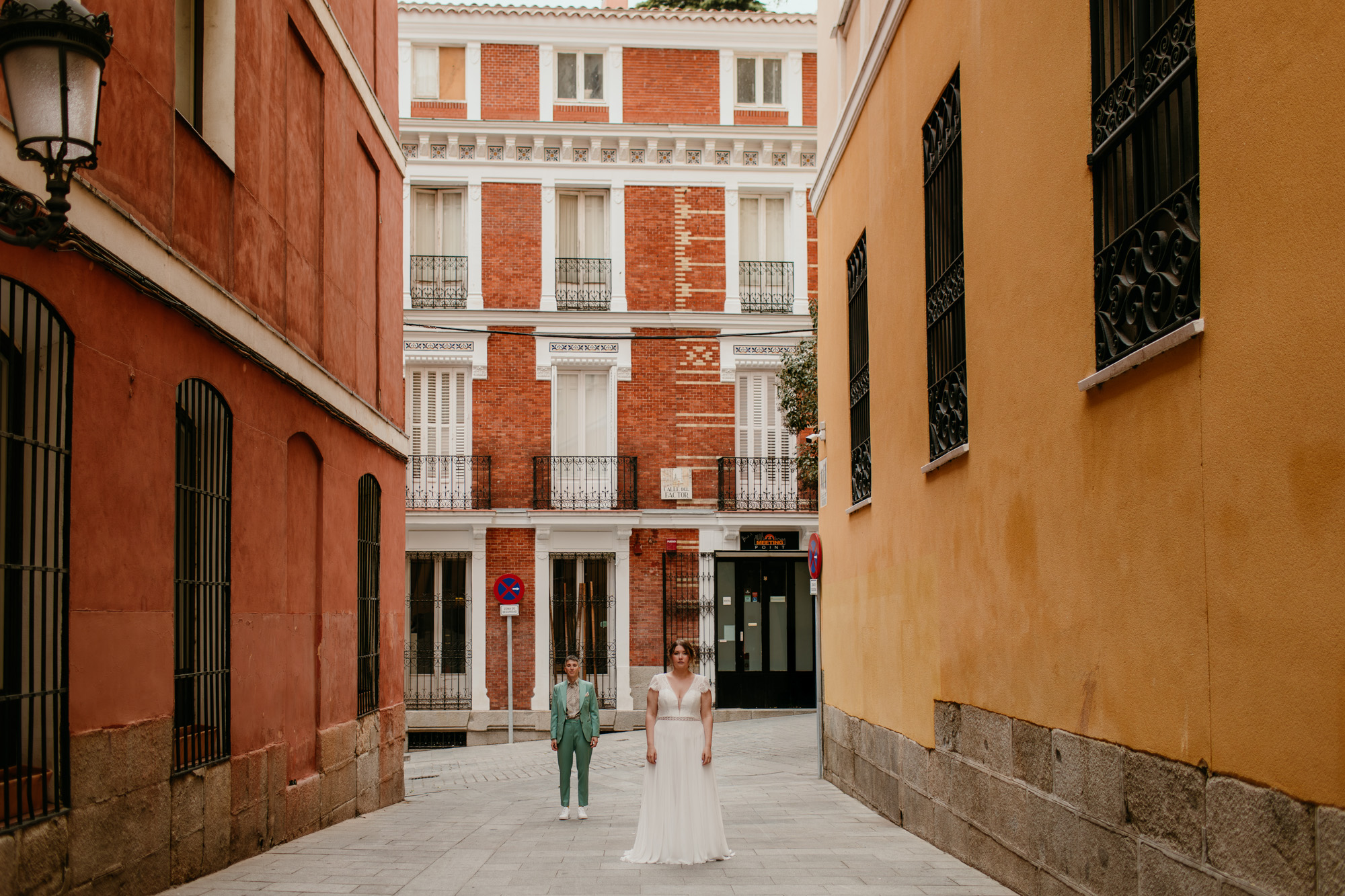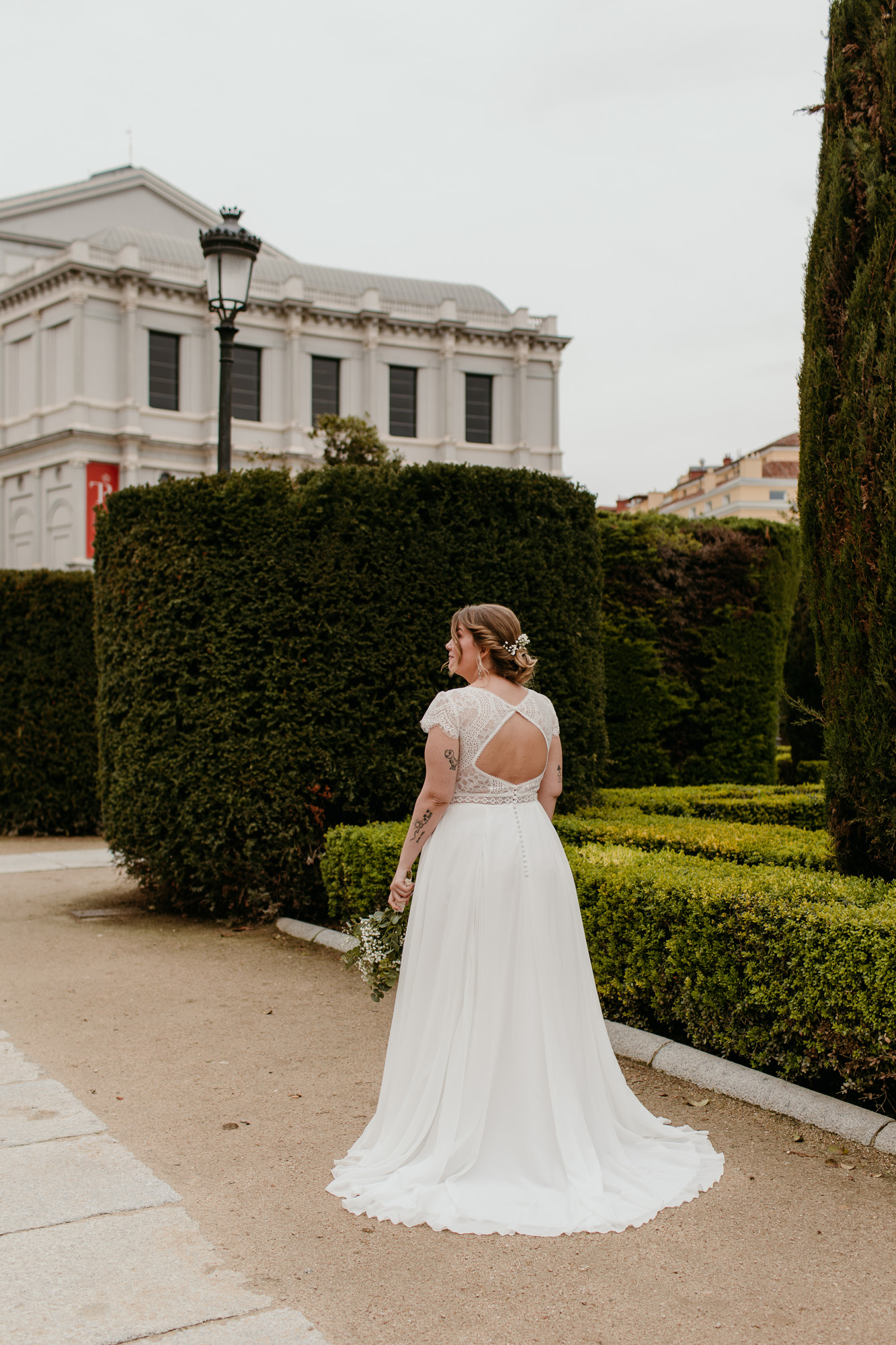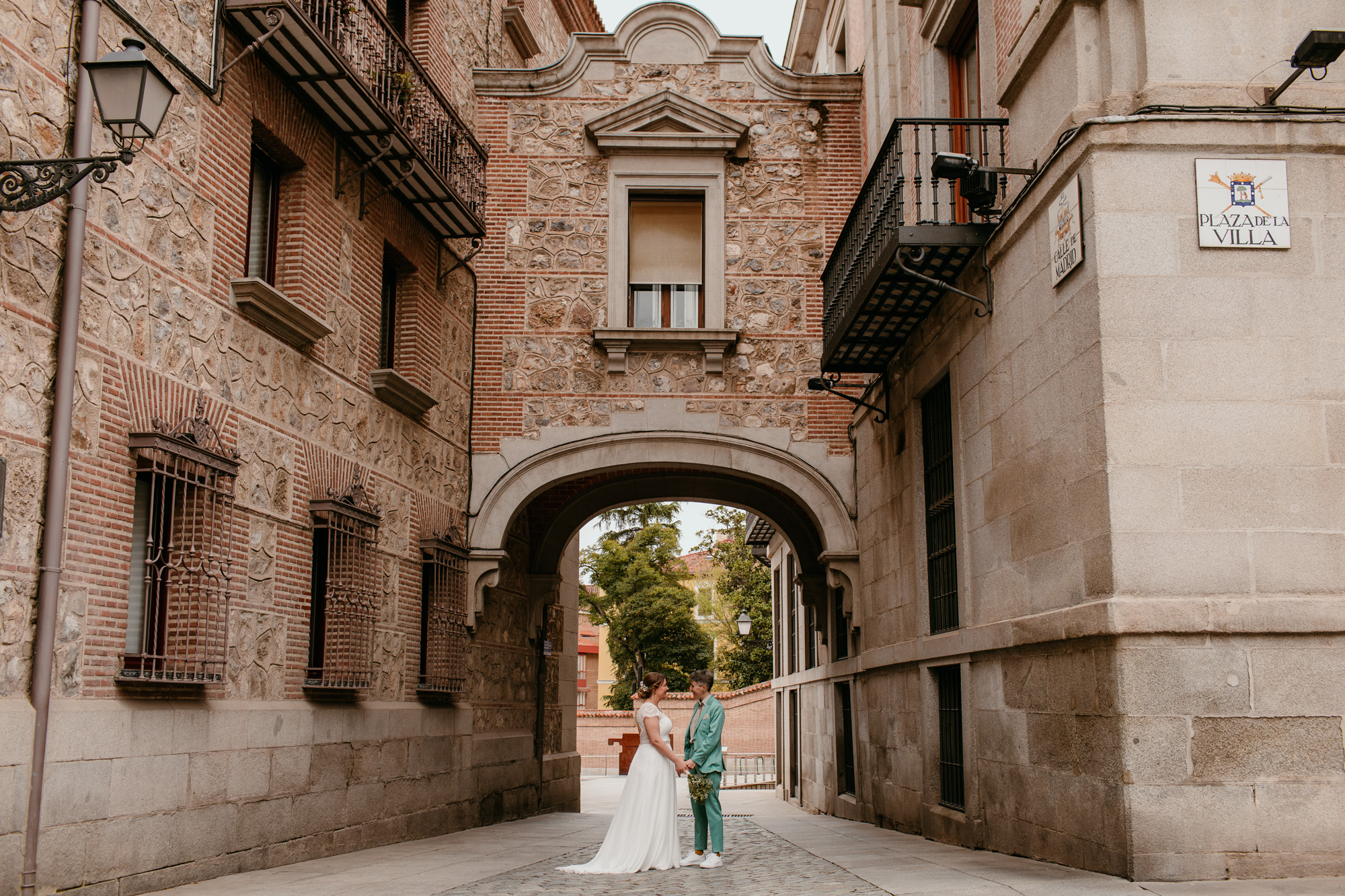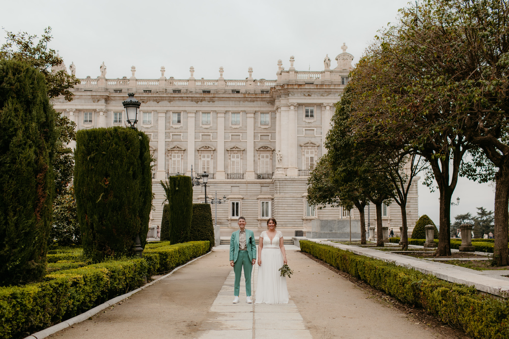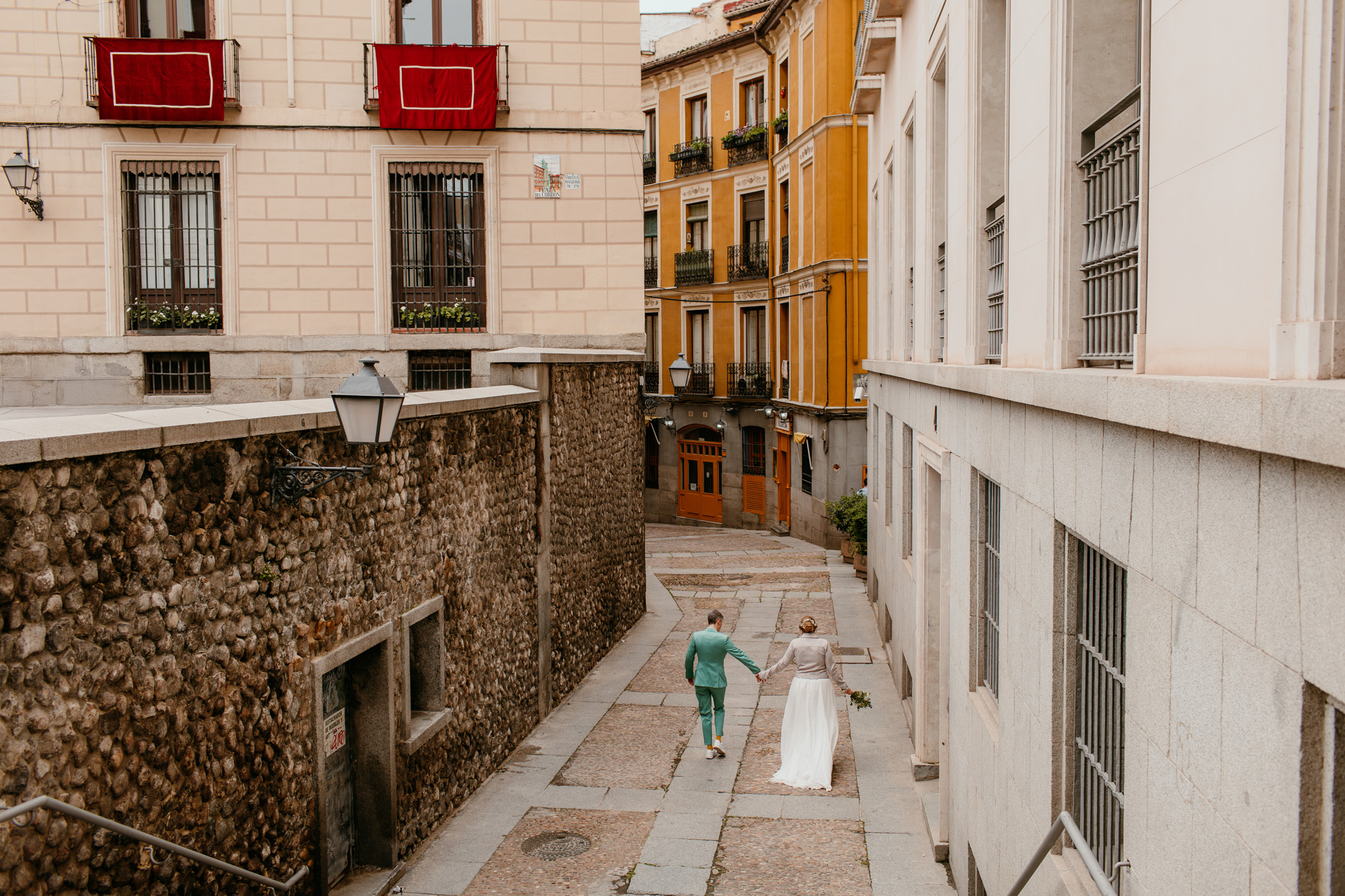 La íntima boda en el centro de Madrid, con la ciudad como telón de fondo. Paseamos por rincones míticos como el Palacio Real, los edificios de Plaza de España o la Catedral de la Almudena, y también nos adentramos en calles menos transitadas, donde descubrimos rincones que parecían sacados de una postal clásica de Madrid.