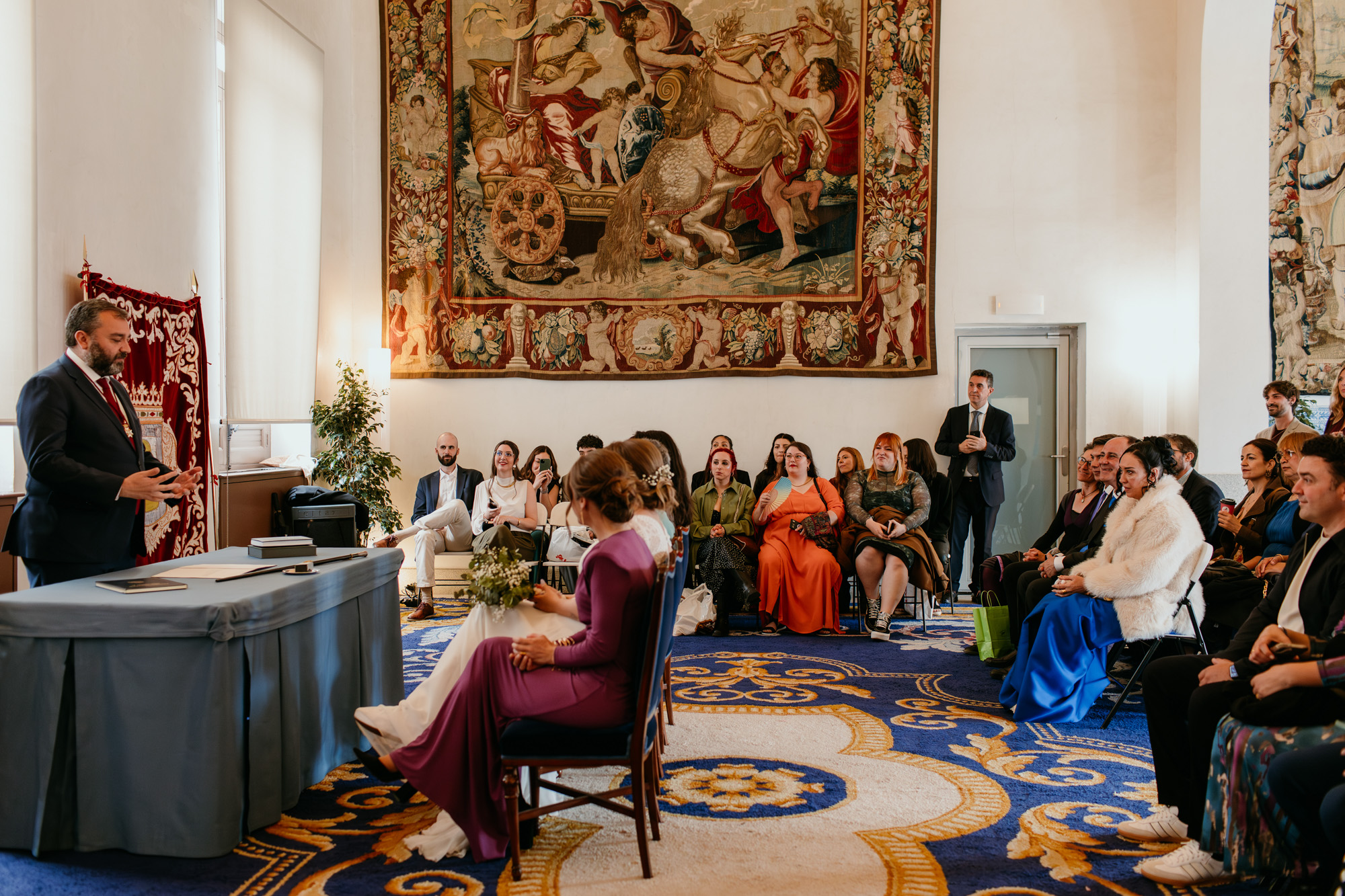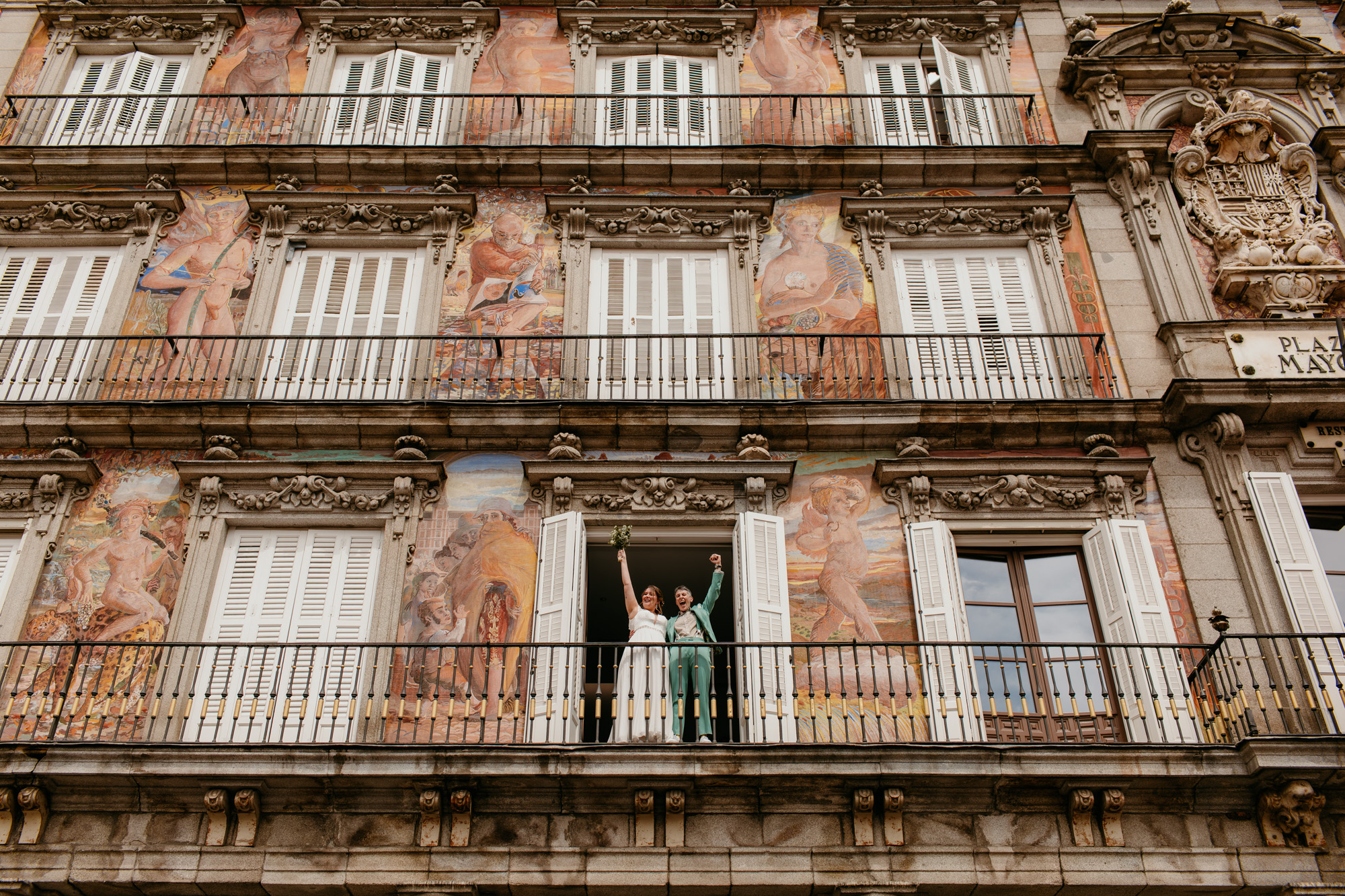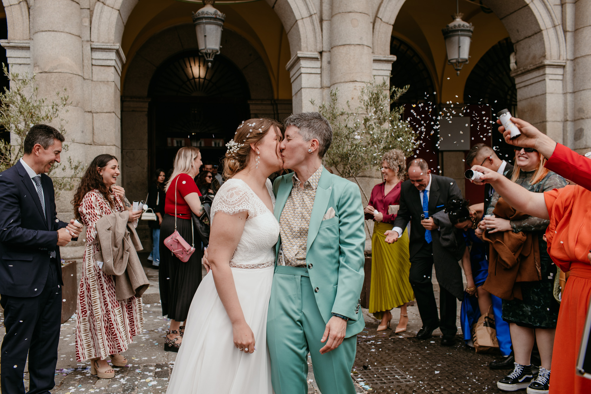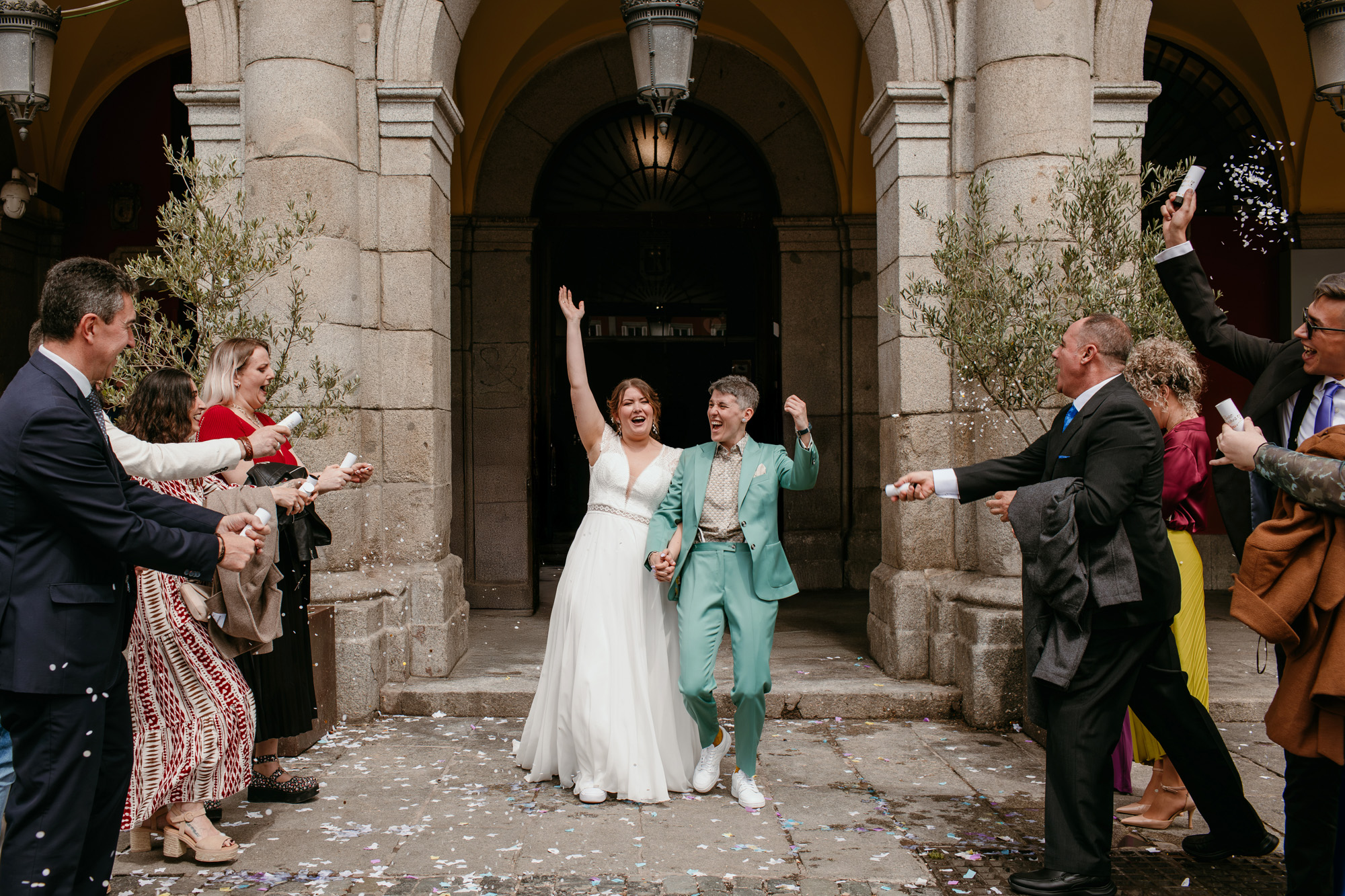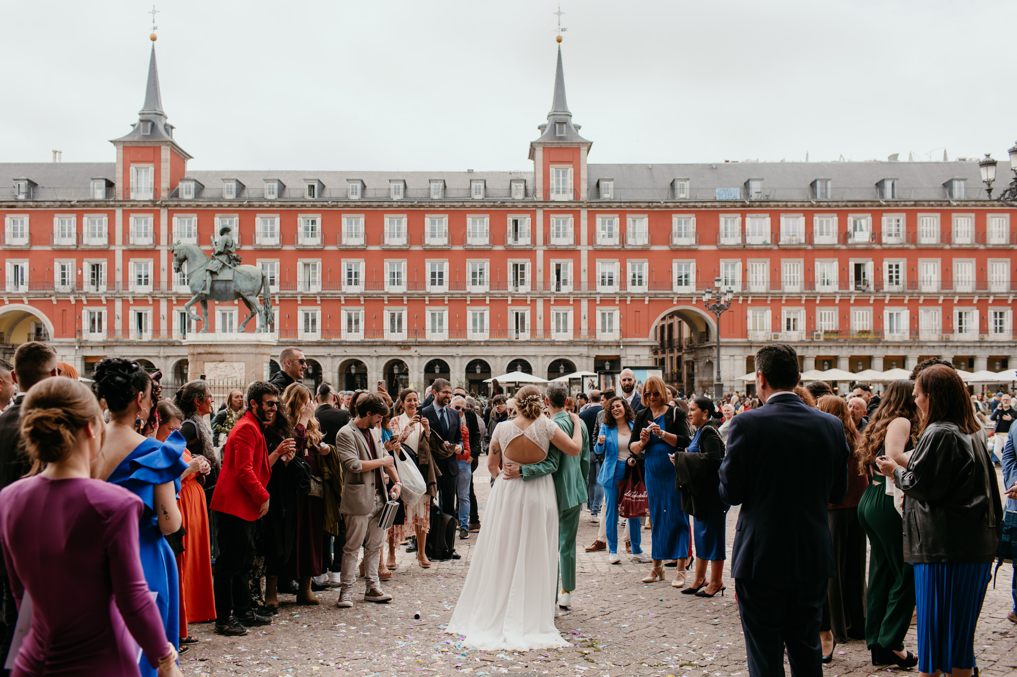 Pero lo más especial nos esperaba en la Plaza Mayor, donde la ceremonia civil tuvo lugar en la Casa de la Panadería, uno de los espacios más emblemáticos para casarse en Madrid. Allí, rodeados de familiares y amigos, la emoción llenó cada instante: abrazos que ponían la piel de gallina, sonrisas que lo decían todo y miradas capaces de transmitir más que cualquier palabra.
