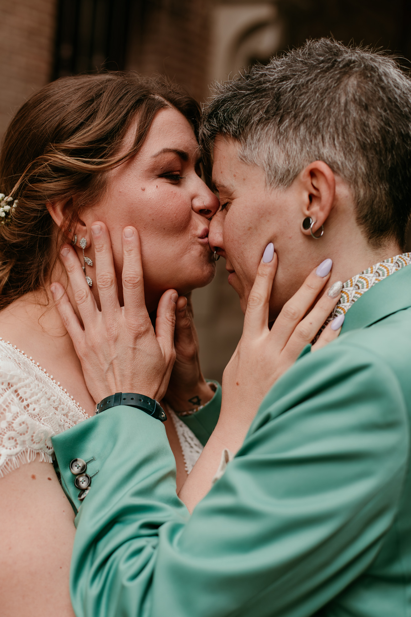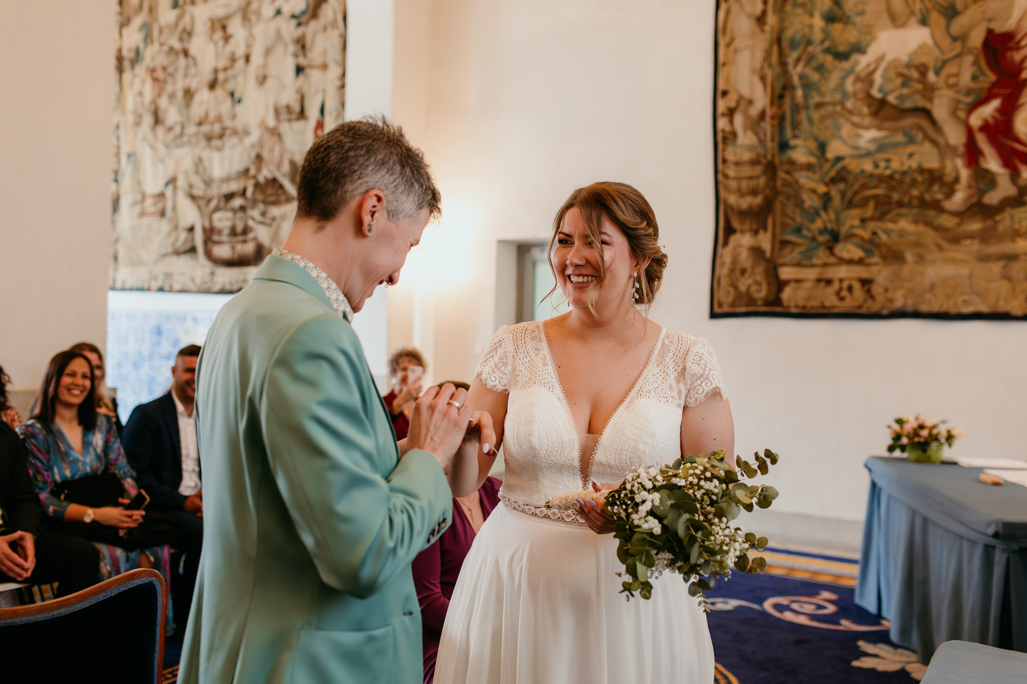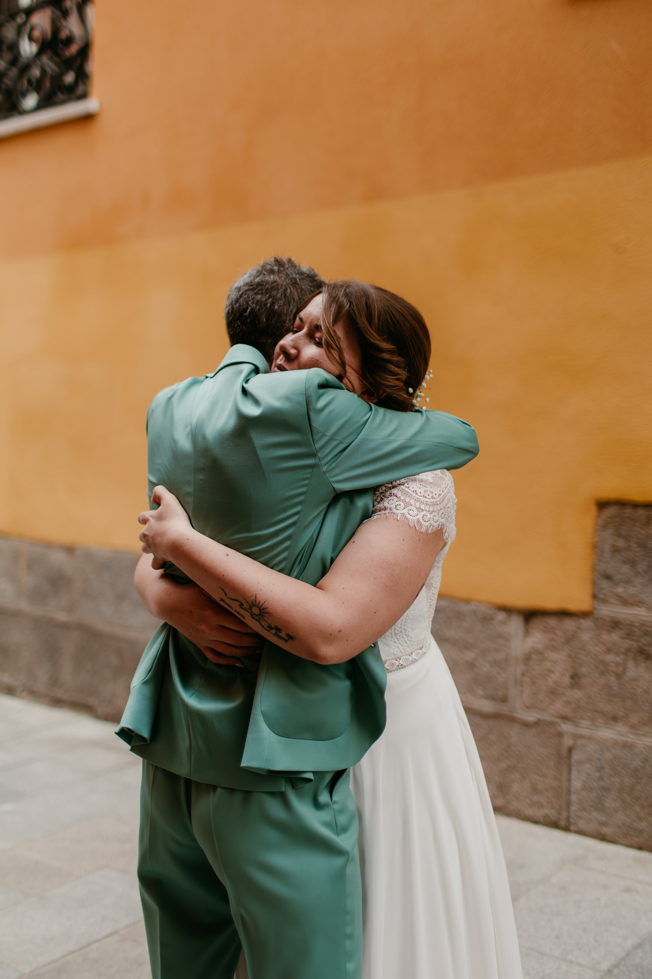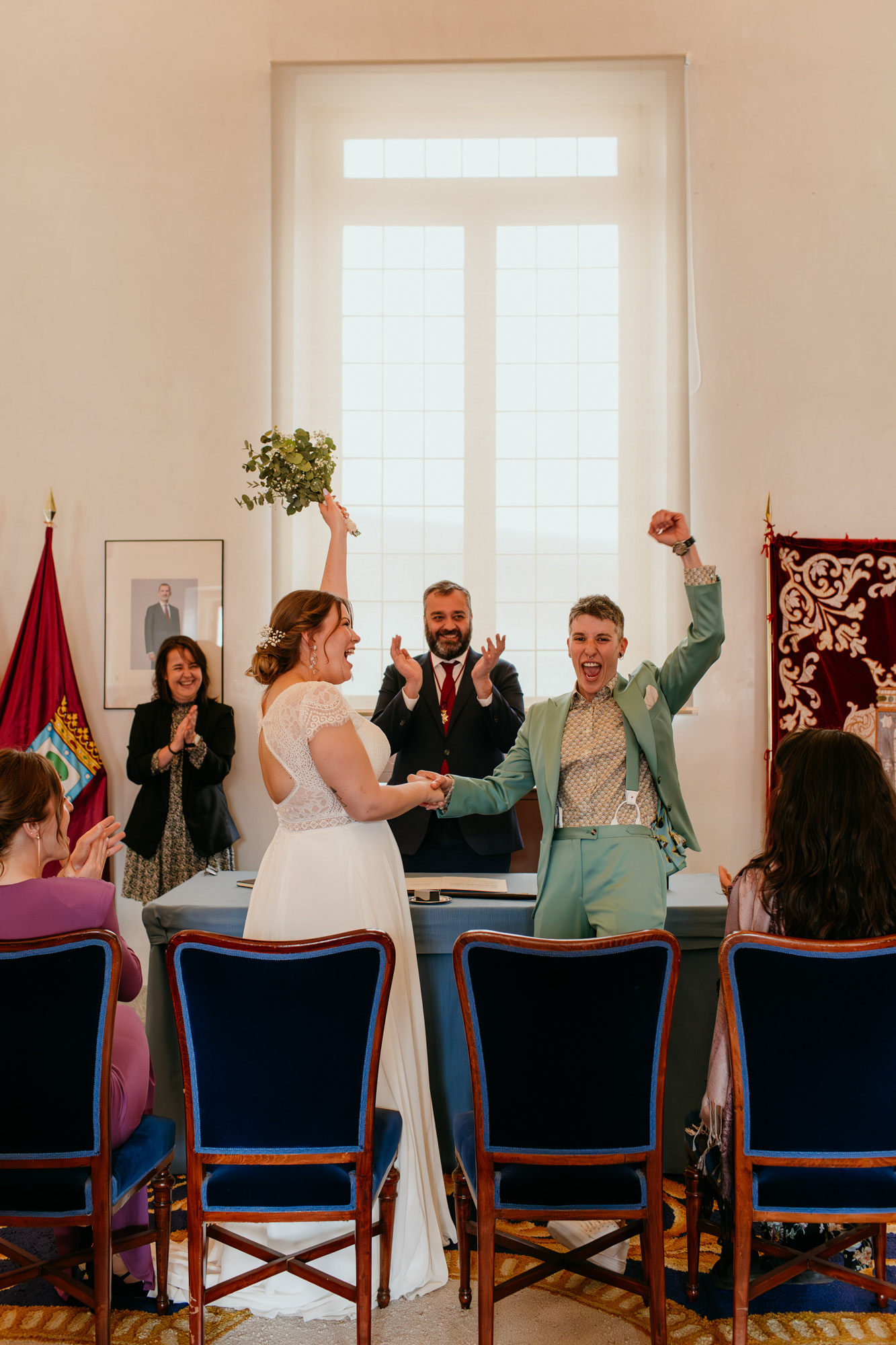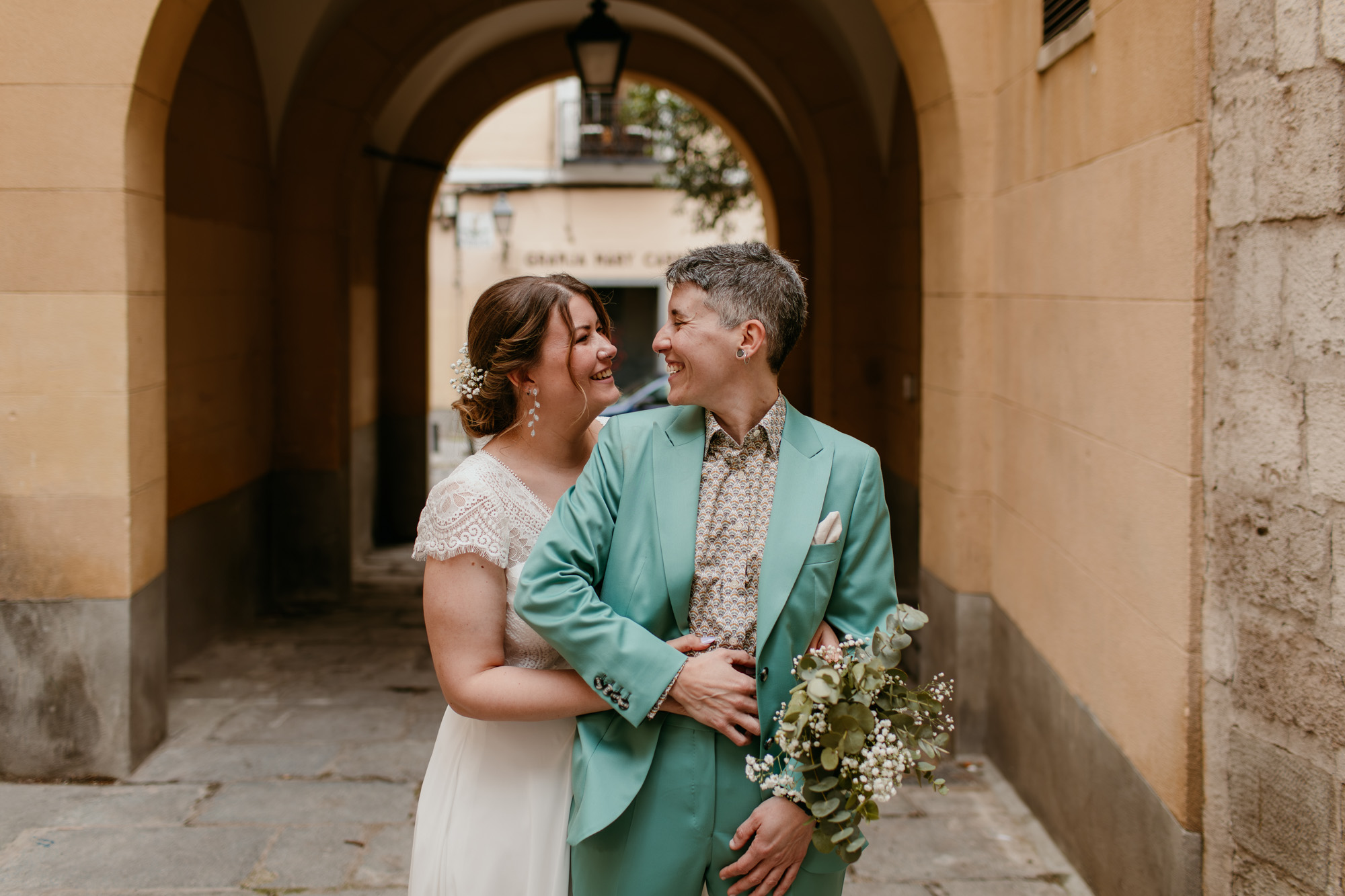 Pero lo más especial nos esperaba en la Plaza Mayor, donde la ceremonia civil tuvo lugar en la Casa de la Panadería, uno de los espacios más emblemáticos para casarse en Madrid. Allí, rodeados de familiares y amigos, la emoción llenó cada instante: abrazos que ponían la piel de gallina, sonrisas que lo decían todo y miradas capaces de transmitir más que cualquier palabra.