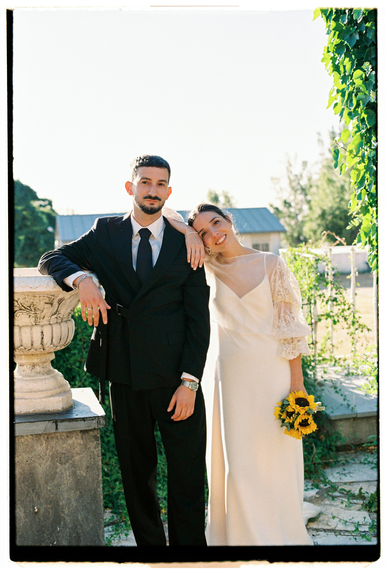 La novia lució un precioso vestido de Atelier Lorena Merino, con falda evasé y cola. Su look era ligero, elegante y fiel a su personalidad. Los detalles del tejido y el volumen de las mangas añadían sofisticación sin perder naturalidad. Mientras que el novio vistió un traje diferente y único que rebosaba estilo.